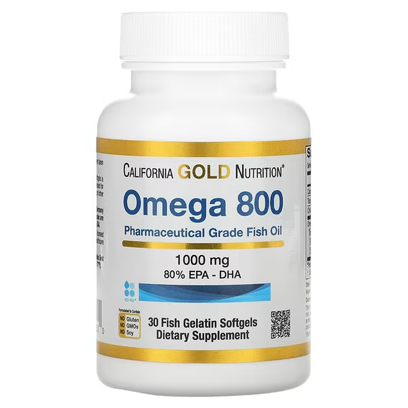 Omega 800 від California Gold Nutrition® використовує виключно KD-PÜR® IFOSTM 5-зірковий концентрат риб'ячого жиру, оброблений у Німеччині, і був спеціально розроблений для людей, яким потрібна надконцентроване дозування м'яких гель раз на день. На дозу Omega 800 пропонує риб'ячий жир найвищої якості, що містить не менш ніж 800 мг EPA/DHA, за найкращою загальною вартістю.
