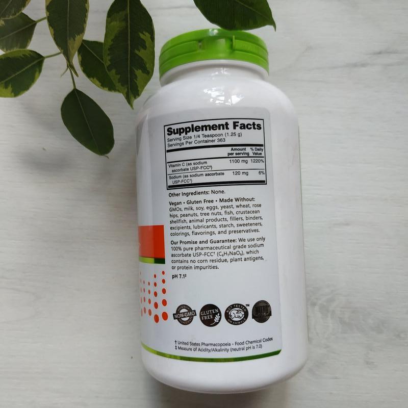 аскорбат натрію NutriBiotic® — це не має гіркого присмаку, некислий буферний кристалічний порошок, що містить 100%-ний вітамін C (L-аскорбінову кислоту) фармацевтичної ступеня чистоти і натрій в добре розчинній формі. Витамин C и натрий являются важнейшими питательными веществами для организма. Витамин C обеспечивает антиоксидантную защиту иммунной системы, а также поддерживает здоровье кровеносных сосудов, тканей, хрящей, костей, глаз и других систем органов. Кроме того, он необходим для биосинтеза коллагена, L-карнитина и нейромедиаторов. Натрий — это электролит, помогающий поддерживать баланс воды в клетках и вокруг них, контролировать стабильное кровяное давление, а также имеющий важное значение для мышечной и нервной систем. Все это делает витамин C и натрий жизненно важными для поддержания здоровья всего организма. Каждая порция содержит 1100 мг витамина C и 120 мг натрия.