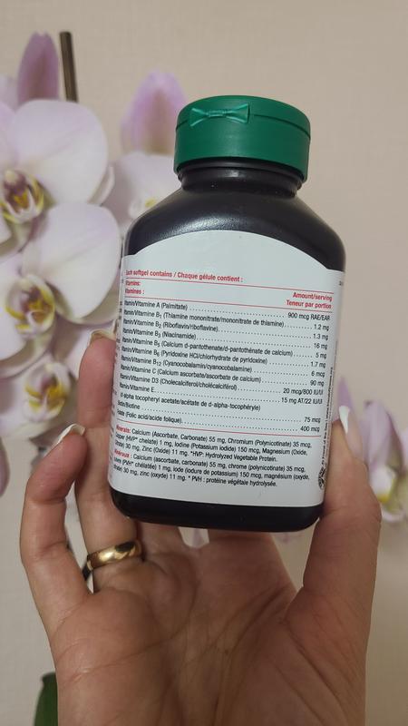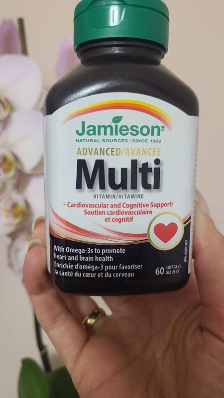 Jamieson's Advanced Multi + Omega-3 забезпечує принаймні 100% рекомендованої Міністерством охорони здоров'я Канади добової дози всіх включених вітамінів. Цей передовий полівітамін складається з 250 мг жирних кислот Омега-3 для підтримки здоров’я серця та мозку, без рибного присмаку