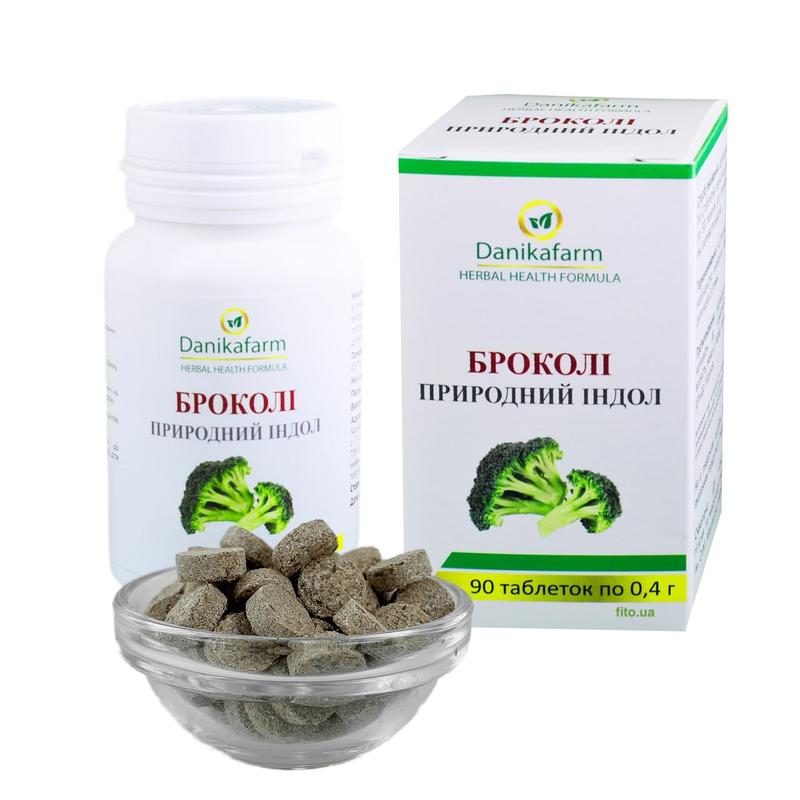 Брокколі в таблетках - активний захист організму від новоутворень молочної залози, матки, гіперплазії ендометрію, передміхурової залози, розвитку кіст, папілом, забезпечує імунний захист, обмінні процеси в кістковій та сполучній тканинах. Склад: суцвіття броколі, молочний цукор, картопляний крохмаль. Застосовуються: гормонозалежні новоутворення молочної залози, матки, яєчників, передміхурової залози; міома матки, фіброміома; фіброзно-кістозна мастопатія; дисплазія шийки матки; порушення менструального циклу; передменструальний синдром; клімактеричний синдром; пізній клімакс; ендометріоз; синдром полікістозних яєчників; безпліддя; зниження ризику гормональної терапії; інтоксикації, всіх видів; алергічні проблеми; порушення функції печінки (гепатит, гепатоз); папіломавірусна інфекція (папіломи, гострі кондиломи, респіраторний папіломатоз); папіломатоз органів жіночої статевої сфери; профілактика передчасного старіння Спосіб застосування: по 2 таблетки 2-3 рази на день за 30 хвилин до їди. Курс 8-12 тижнів. При потребі повторити. Упаковка: 90 пігулок. Не є лікарським засобом.