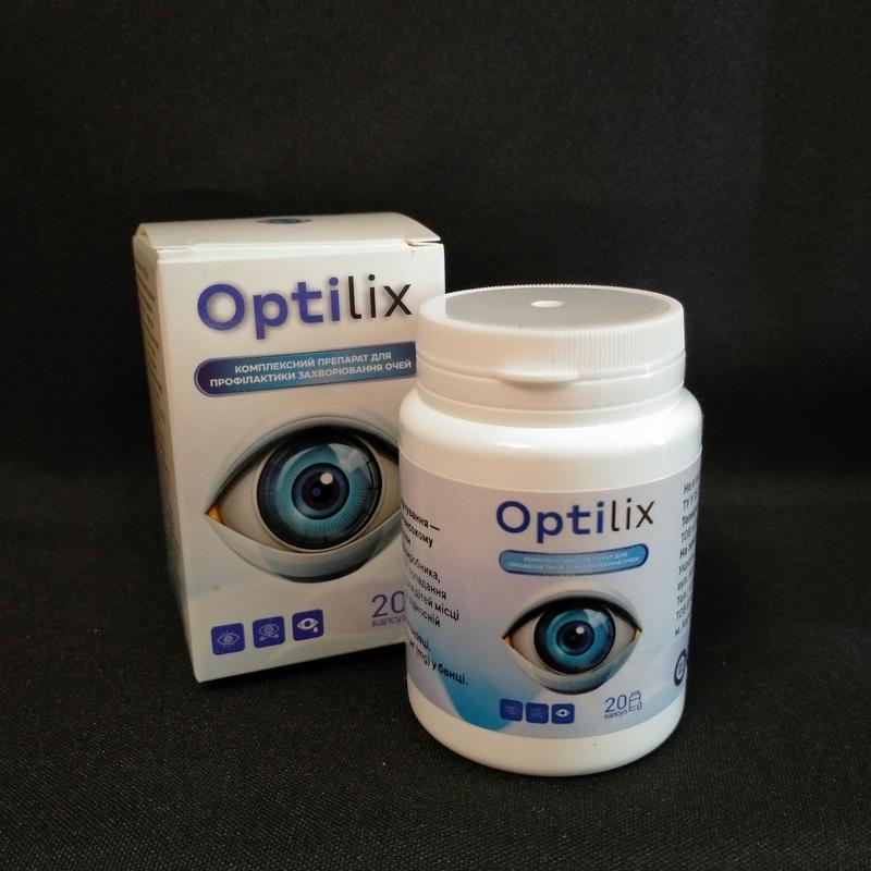 Optilix рекомендовано приймати як дієтичну добавку до раціону харчування - джерело вітаміну С, особам при високому навантаженні на орган зору. Не слід використовувати як заміну повноцінного раціону харчування. Склад: цукор, порошок чорниці, крохмаль картопляний, антиоксидант аскорбінова кислота, наповнювач кальцію стеарат, стабілізатор КМЦ, лютеїн, вітамінний премікс. Рекомендовано приймати: дорослим по 1 капсулі 3 рази на день під час вживання їжі, запивати водою. Не перевищувати рекомендовану добову дозу. Курс прийому — 1-2 місяці, повторити курс через 2-3 місяці. Протипоказання: індивідуальна чутливість до окремих компонентів. *Не є лікарським засобом. Всі результати індивідуальні для кожного організму. Перед прийманням проконсультуйтеся з лікарем.