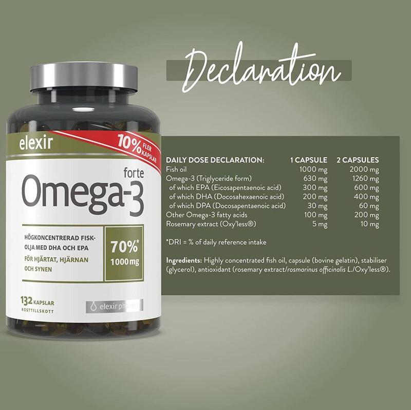 Еліксир Omega - 3 Forte від містить поліненасичені жирні кислоти такі як ЕРК і ДГК, які сприяють нормальній роботі серця і очей в оптимальному співвідношенні. Еліксир Omega - 3 Forte виробляється в Норвегії від постачальників, які ловлять рибу в екологічно чистих водоємах. EPА - має протизапальні властивості та підтрим сердцево-судинну систему. DHA - важлива для функціонування мозку, зору та нервової системи. Для оптимального здоров'я рекомендується вживати достатню кількість обох кислот, але DHA має бути в більшому обсязі. Актуально за проблематикою: для серця, судин, мозку, зору, шкіри, імунітету, протизапальна дія, природний антидепресант, для пам'яті та концентрації, для чоловіків/жінок. Приймати 1-2 капс. на день під час прийому їжі.