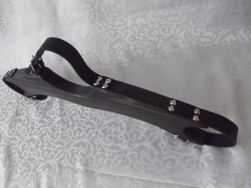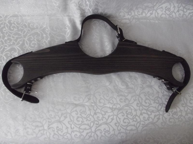 Цей продукт БДСМ виготовлений із берези. Дерево вкрите тиковим маслом і має чорний колір. Ремені виготовлені з натуральної чорної шкіри. Ремені склеєні з двох шарів шкіри. Тому вони мають велику товщину, але залишаються дуже м'якими та ніжними.