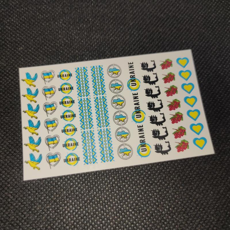 Патріотичні слайдери для нігтів 8*5 см. Для використання потрібно вирізати потрібний фрагмент. Покласти його паперовою стороною на серветку змоченою водичкою. Обережно відокремити наклейки-плівку штампом або пінцетом для декору. Перенести фрагмент на нігтик. Просушити від води та закріпити топом або прозорим лаком. Дизайн готовий.