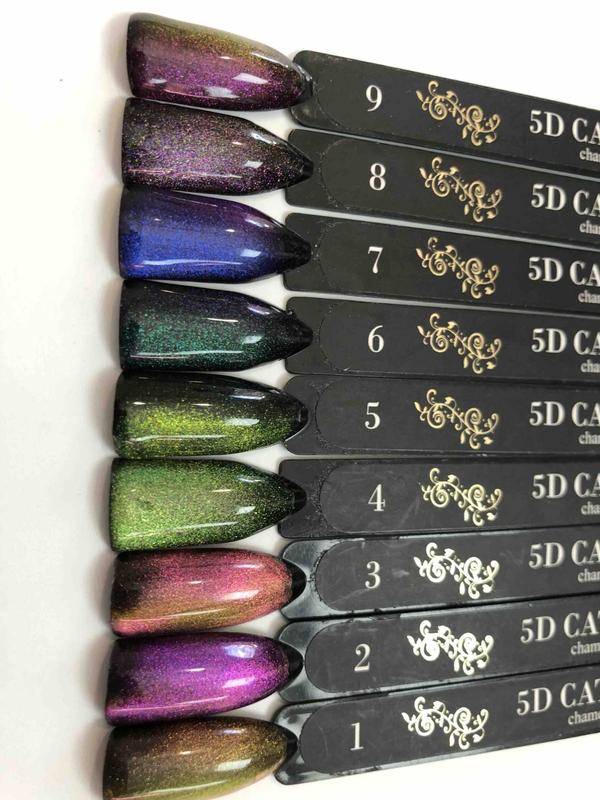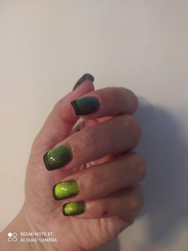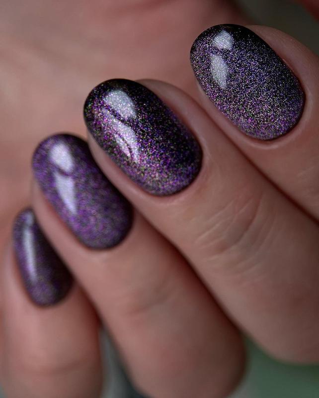 Переливається різними кольорами. Потребує темну основу для глибшого переливу. Пігментований, стягується сильним магнітом.