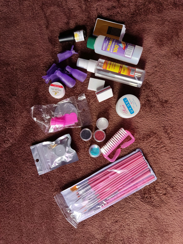 Аксесуари для манікюру, пензлики - 15 шт, рідина для зняття гель лаку 40мл, обезжирювач 70мл, штамп, втирка, прищепки, баф 2шт, чорнило, блискітки, гель для нарощення, форми для нарощення.