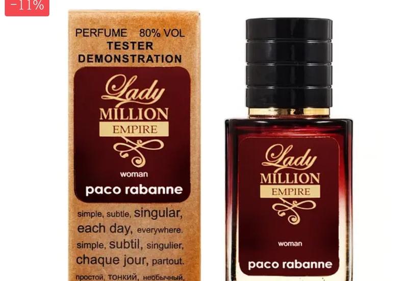 До нанесення Paco Rabanne Lady Million Empire в демонстраційному флаконі слід ставитися з особливою повагою. Для кого-то він буде здаватися нудотним і різким. Справа в правильному використанні. Аромат розкривається дуже довго. Через 30 хвилин «сідає» на шкіру ідеально. Підсумковий запах пахне зухвалістю і багатством. Його насиченості можна позаздрити. Солодкість відчувається в міру. Це затишний і обволікаючий аромат. У ньому хочеться перебувати морозною зимою, закутатися в плед і грітися теплою композицією ніжних обіймів.