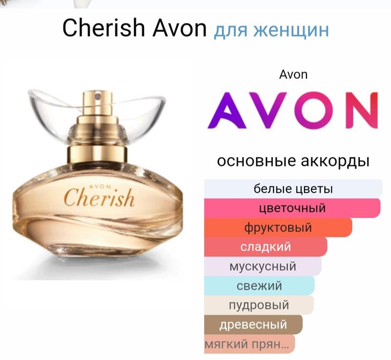 Cherish Avon — аромат для жінок, належить до групи квіткових. Cherish вийшов в 2015 р. Верхні ноти: Рожевий перець, Малина, Бергамот; середні ноти: Квітка вишні, Жасмін Самбак, Мімоза; базові ноти: Тіаре, Білий мускус, Сандал.