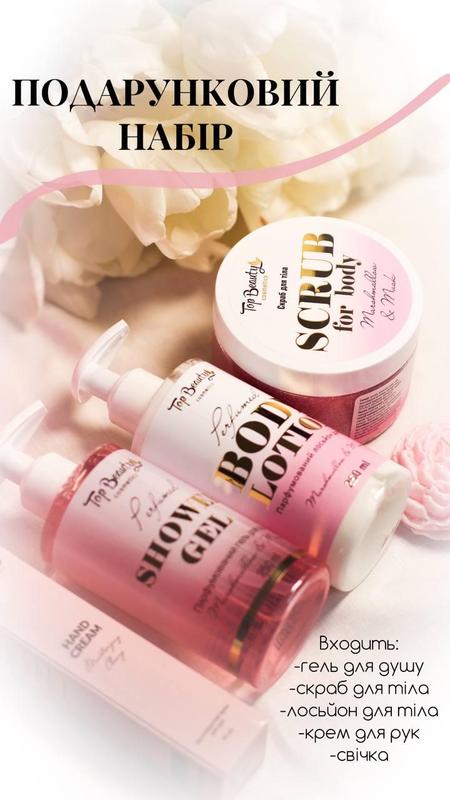 - парфумований лосьйон для тіла з ароматом маршмеллоу та мускусу (250 мл) - зволожить і відновить вашу шкіру, подарує їй шовковистість та еластичність;