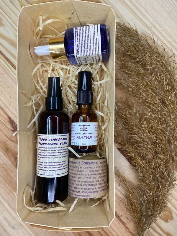 Подарунковий набір натуральної косметики - це чудовий подарунок. Такий подарунок обов'язково порадує своєю естетичною красою і корисним вмістом. Він універсальний, підійде як юній дівчині, так і жінці, а можливість варіювати вмістом і оформленням допоможе надати кожному набору індивідуальність. В состав набора входит натуральное шампуневое твердое мыло "Крапивушка", которое эффективно очищает волосы и кожу головы, бальзам для волос «Суперволосок» закрывает волосяные чешуйки, питает, укрепляет волосы, облегчает расчесывание и укладку, придает блеск и здоровый вид, гидролат «Апельсин» продлевает ощущения свежести кожи головы и нормализует выделение сального секрета. Все средства можно подобрать в одной цветовой гамме, благодаря чему набор смотрится очень нежно и красиво. Наборы можно скорректировать по Вашему желанию. Цена набора зависит от содержимого. Склад шампуневого мила «Крапивушка»: омилення олії оливи, соняшнику, кокосове масло, масло виноградних кісточок, відвар кропиви, лаванди, імбиру, лимонна кислота, ефірні олії лемограсса, лаванди, анісу. Склад бальзаму «Суперволосок»: масло ши, какао, кокоса, канделильский віск, пальмовий віск, бджолиний віск, масло макадамії, е. м. іланг-іланг.