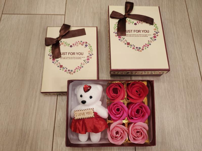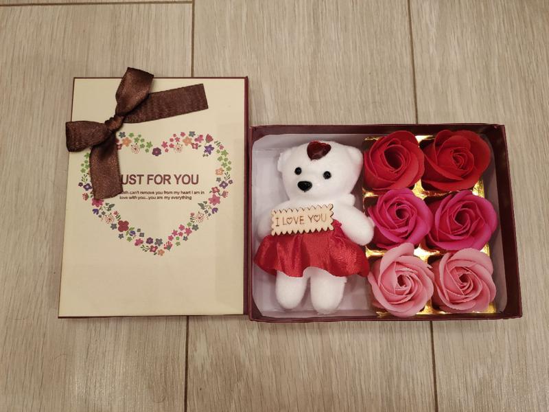 Подарунковий набір троянд з ароматною крем-піни в красивій упаковці з бантом. Набір упакований в красиву подарункову упаковку з красунечкою михайликом в юбчонке. Дуже красивий і зворушливий подарунок. У наборі 6 трояндочок. Пелюстки троянд зроблені з гліцеринового мила, тому їх можна використовувати як крем-піни для ванни. Пелюстки мають легкий приємний квітковий аромат. Розмір трояндочки: 4*3см