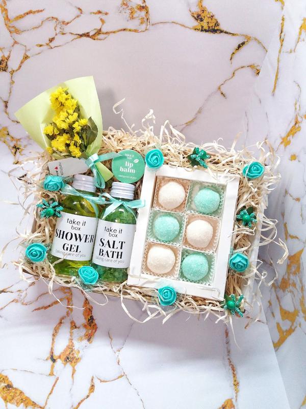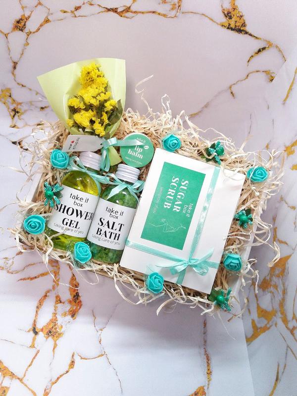 1. Цукровий скраб для тіла з ароматом ківі та кокосові (наша ручна робота) 2.Натуральний бальзам для губ без ароматизаторів і барвників (наша ручна робота) 3.Гель для душу 175 мл 4.Сіль для ванни 180 гр 5.Букетик сухоцвітів (наша ручна робота) 6.Подарункова коробка з наповнювачем та стрічкою У нашому інтернет магазині великий асортимент унікальних подарункових боксів ручної роботи - Оригінальні і корисні подарунки - Пайові подарунки - Подарункові бокси на День Народження - Бокси для чоловіків - Новорічні бокси - Секретний Санта - Бокси до дня Св. Валентина - Бокси на 8 березня - Індивідуальні подарункові бокси - Широкий асортимент - Приємні ціни - Індивідуальний підхід до кожного клієнта, врахуємо всі ваші побажання - Доставка по всій території України ( Нова Пошта, УкрПошта, Justin)
