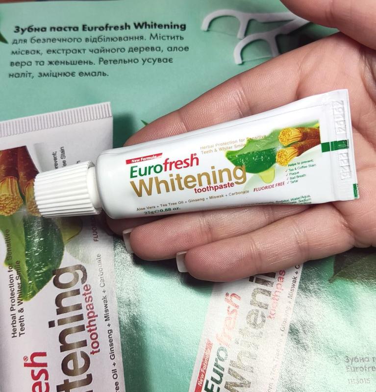 Відбілююча паста для зубів Eurofresh містить місвак, екстракт чайного дерева, алое вера та женьшеню.