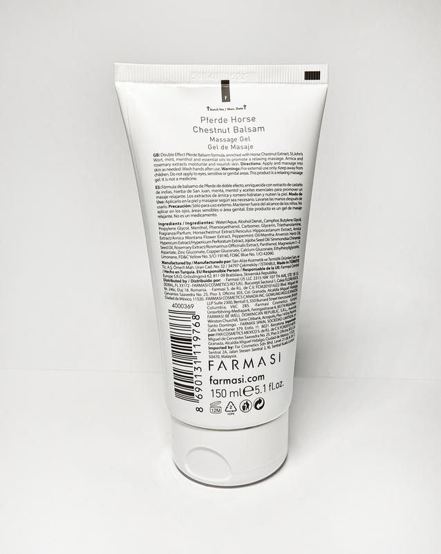 Склад: Water/Aqua, Alcohol Denat., Camphor, Butylene Glycol, Propylene Glycol, Menthol, Phenoxyethanol, Carbomer, Glycerin, Triethanolamine, Fragrance/Parfum, Horsechestnut Extract/Aesculus Hippocastanum Extract, Arnica Extract/Arnica Montana Coarseness Extract, Peppermint Oil/Mentha Arvensis Herb Oil, Hypericum Extract/Hypericum Perforatum Extract, Jojoba Seed Oil/ Simmondsia Chinensis Seed Oil, Rosemary Extract/Rosmarinus Officinalis Extract, Panthenol, Magnesium 1 – 2 Aspartate, Zinc Gluconate, Copper Gluconate, Calcium Gluconate, Ethylhexylglycerin, Limonene, FD&C Yellow No. 5/CI 19140, FD&C Blue No. 1/CI 42090.