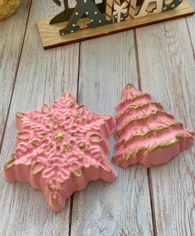 Ще одна рожева новинка чудовий подарунок до Нового Року🎁, можемо зробити будь-який аромат і колір😍, в наявності сніжинка з золотим шиммером🌟аромат кориця 🍊 90грн маленька ялинка 65 , бомбочки з піною Товар виготовляється на замовлення