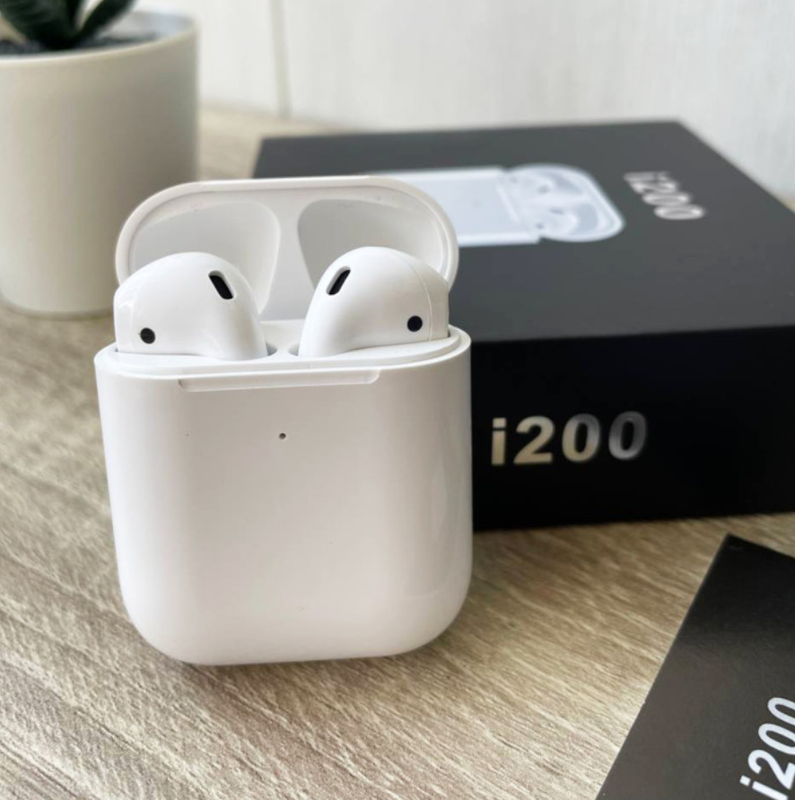 Бездротові навушники AirPods i200 - якісний аналог AirPods з Bluetooth 5.0, сенсорним управлінням і потужним звуком. Миттєве підключення до iOS при відкритті кришки (рівень заряду відображається на екрані). Вбудовані мікрофони з шумозаглушенням забезпечують чіткі дзвінки. Кейс підтримує бездротову зарядку і заряджає навушники до 2,5 годин роботи. Характеристики: Тип підключення: Bluetooth 5.0 Сумісність з усіма пристроями Bluetooth Вихідна потужність: 28 мВт Частотна характеристика: 20-20000 Гц Чутливість: 42 дБ Робоча відстань бездротової гарнітури: до 10 м ,Час роботи в режимі очікування: до 24 годин Час роботи у режимі прослуховування музики: до 3 годин Час роботи в режимі розмови: 2-3 години Матеріал: пластик (динамік захищений алюмінієвою сіткою) Комплектація: Бездротові навушники TWS TWS i200 Зарядний кабель Lightning – USB Коробка / Інструкція