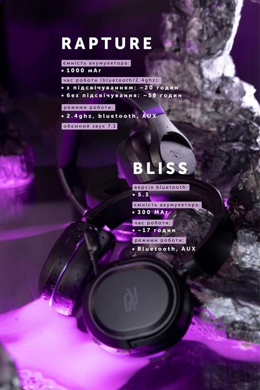 Бездротова ігрова гарнітура Proove Gaming Rapture – неперевершені враження! Серія Proove Gaming змінить ігровий досвід справжніх геймерів раз і назавжди. Висока якість, комфорт, увага до деталей створюють ідеальну комп'ютерну периферію та занурюють у всесвіт найулюбленіших ігор. Основні характеристики: - Версія Bluetooth: 5.3; - Протоколи: A2DP, HFP, HSP, AVRCP; - Декодек: SBC, ААС; - Тип акумулятора: літієвий; - Ємність акумулятора: 1000мАг; - Час роботи: З підсвічуванням (Bluetooth): до 80% гучності ~25 год; Без підсвічування (Bluetooth): до 80% гучності ~75 год; З підсвічуванням (2.4 ГГц): до 80% гучності ~25 год; Без підсвічування (2.4 ГГц): до 80% гучності ~42 год; - Час заряджання акумулятора: ~2 години; - Режими роботи: 2.4ГГц, Bluetooth, AUX; - Розмір динаміка: Ø40 мм; - Частотний діапазон: 20-20000Гц; - Опір: 32Ω±15%; - Чутливість мікрофона: 42±3дБ; - Чутливість динаміків: 113±3дБ; - Порт: Type-C. Комфорт Proove Gaming Rapture створює ідеальну атмосферу для відеоігр, поринаючи у світ геймінгу з кожним дотиком. Гучність регулюється безпосередньо з навушників, а сам аксесуар оснащений вбудованим складаним мікрофоном, який не заважатиме у запеклих іграх. Якість звуку Навушники Proove Gaming Rapture поєднують високоякісний звук із стабільним підключенням. Потужний бас, висока деталізація та насичене музичне забарвлення розкриють нові грані ігрового досвіду. Термін служби батареї При підключенні через Bluetooth і ввімкненому підсвічуванні гарнітура працює до 25 годин при гучності 80%. У разі вимкненого підсвічування час автономної роботи значно збільшується і досягає приблизно 75 годин. У режимі підключення через 2.4 ГГц з увімкненим підсвічуванням батарея також забезпечує до 25 годин роботи, а без підсвічування — до 42 годин. Така гнучкість дозволяє обрати оптимальний режим залежно від потреб, збалансовуючи яскравість і час автономної роботи.