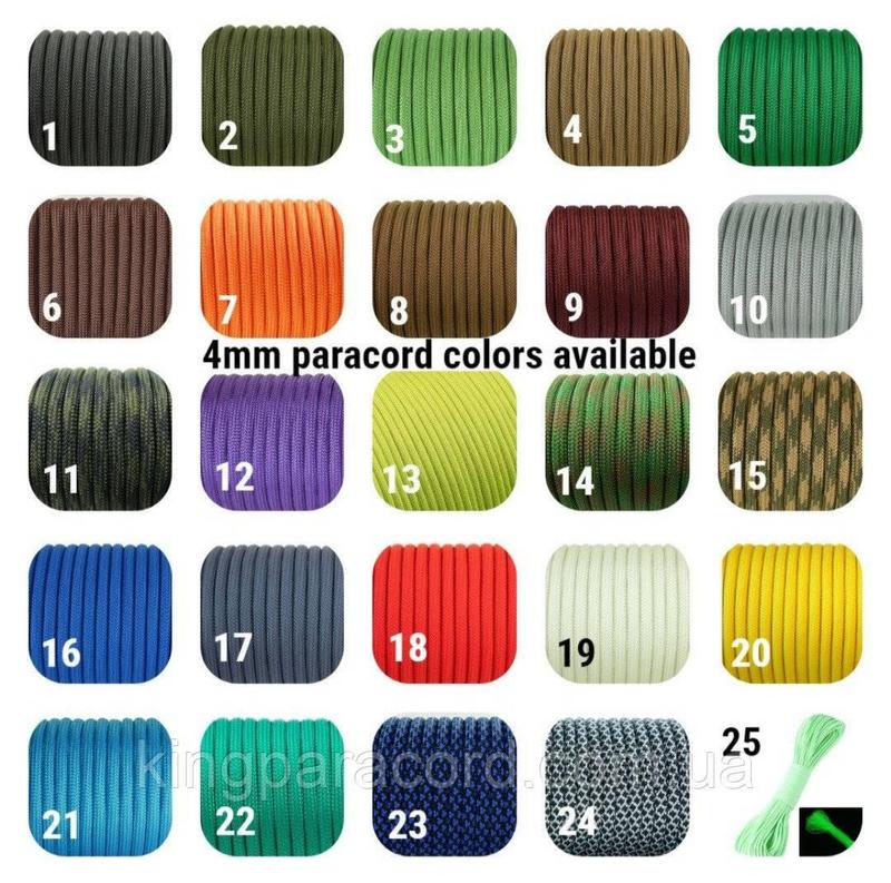 Усі браслети виготовлені з міцного нейлонового шнура — паракорду (діаметром 4