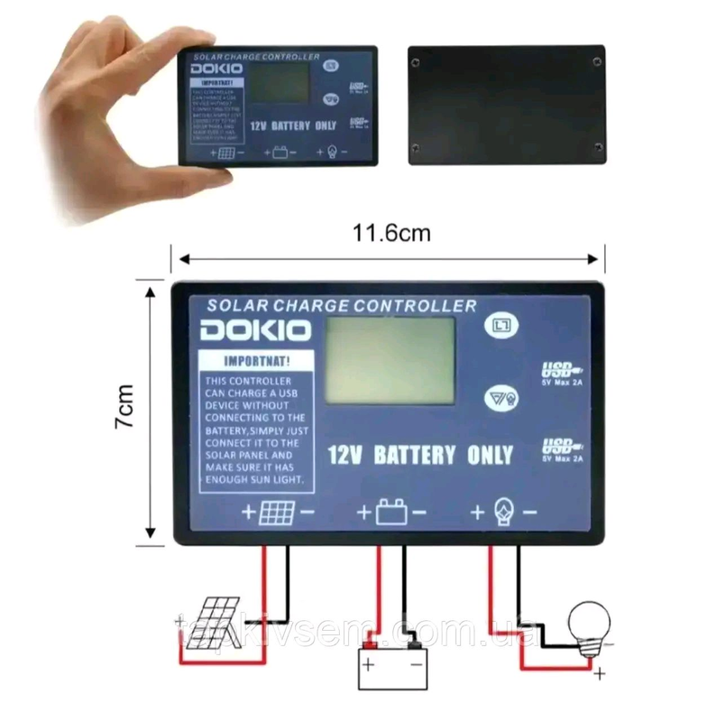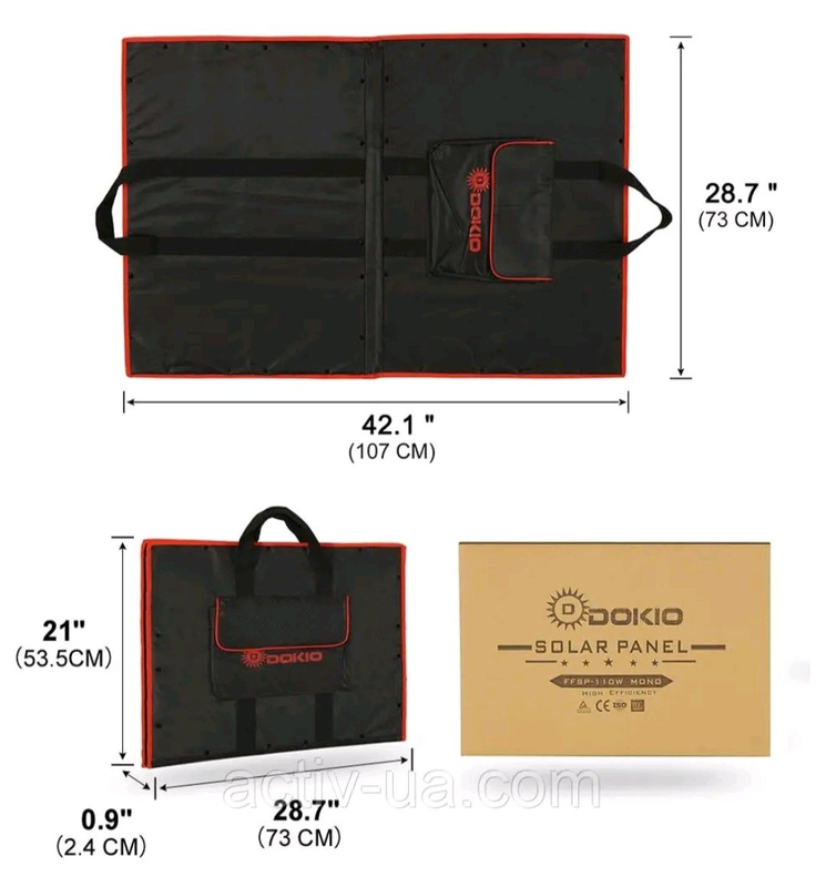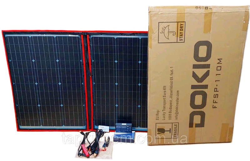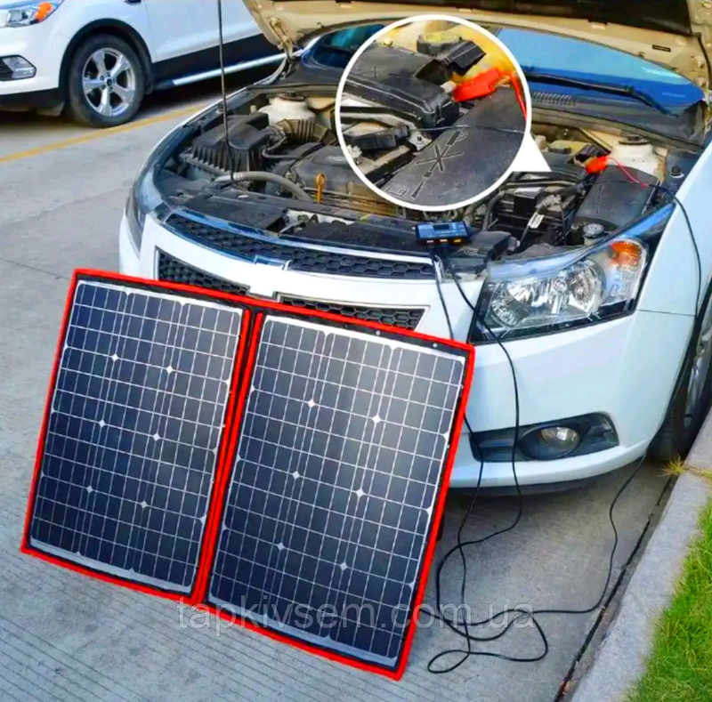 — потужна сонячна панель на 110 W для заряджання автомобільних акумуляторів через контролер за допомогою кабелю крокодила (в комплекті) і мобільних телефонів, смартфонів, планшетів, а також будь-якої іншої електроніки, здатної заряджатися від USB-порту 5V/2A через контролер.