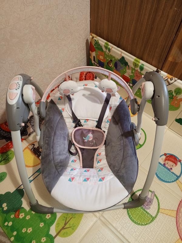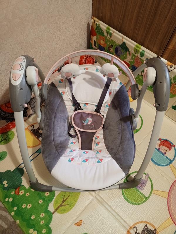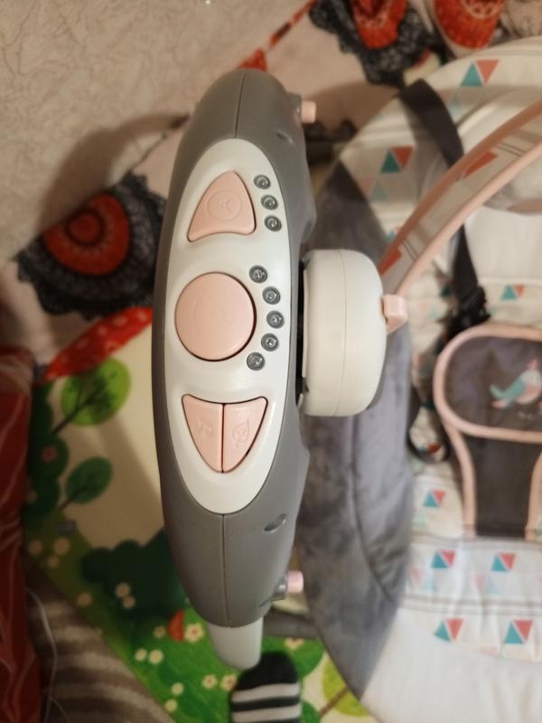 Має положення лежачи та сидячи. Працює від мережі або батарейок. Має приємну музику під яку малюк солодко засинає. Різні режими заколисування від повільного до швидкого.