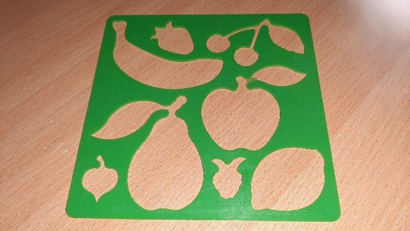 Трафарет пластмасовий Фрукти. За допомогою трафарету можна малювати олівцями , фломастерами, красками, ручкою. Розмір 13х13см. Нові.