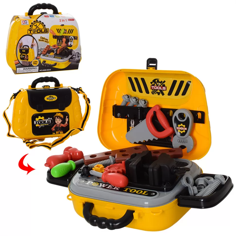 Набір інструментів який можливо скласти в чемодан, кейс і при цьому його зручно брати з собою, адже його можна носити на плечі. Тобто ваш юний майстер може прийти в будь-яке місце будинку і все швидко полагодити. Адже в ігровому наборі інструментів є: викрутки, пила, ключі гайкові, шурупчики. Розміри коробки: 24,5 х 19 х 9 см.
