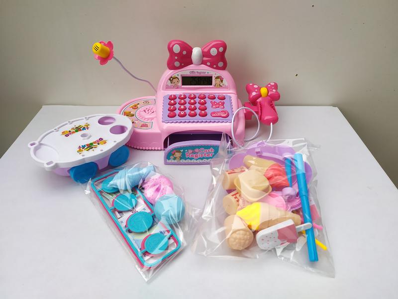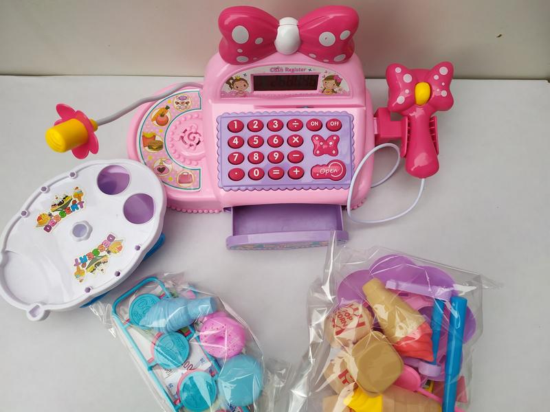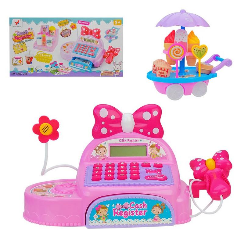 Дитячий касовий апарат на батарейках, мікрофон, калькулятор, сканер, звук,ігрові гроші, продукти, аксесуари, розмір іграшки 20*13см, в коробці 15*29*18см