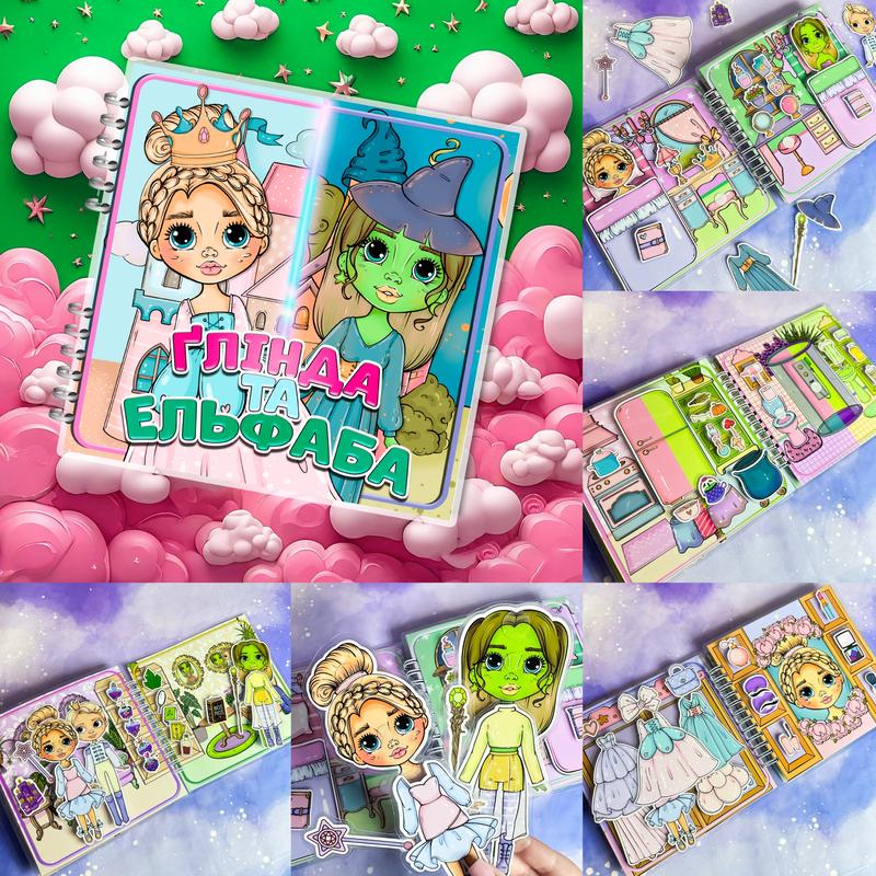 Новий бестселер 🩷Глінда та Ельфаба💚! Ласкаво просимо до чарівного світу двох магічних подруг — Глінди та Ельфаби!🎉🎉🎉🎉 Що всередині? 🩷 Спальня Глінди: затишна рожева кімната з ліжком, письмовим столом, короною та особистим щоденником. 💚 Спальня Ельфаби: загадкова зелена кімната з ліжком, полицями для зілля та власним щоденником. 👗👒 Гардероб: рожевий для Глінди🩷 та зелений для Ельфаби💚. Тут можна підібрати образи і навіть “нанести” макіяж на їхні обличчя! 🍽️ Кухня: поділена на два сектори. 🩷 У рожевому секторі — солодощі та частування, у 💚зеленому — казанок та магічні інгредієнти для зіль. 🫧 Ванна кімната: два яскравих сектори для догляду за собою — рожевий🩷 і зелений💚. 🛋️Вітальня: подвійна кімната, в якій 🩷рожевий сектор Глінди прикрашений чарівною паличкою, шафою з любовними зіллями та милим принцом. 💚Зелений сектор Ельфаби — це куточок магії з книгами, кристалами, картами таро та чарівним посохом. Кожна сторінка наповнена яскравими деталями та елементами на липучках, які дитина може переміщувати, створюючи власні історії. Книга не лише розвиває фантазію, а й навчає дружбі та прийняттю відмінностей. Створіть свою чарівну історію з Гліндою та Ельфабою! Кріплення в книжці - металеві кільця ‼️ Дивіться також інші мої оголошення 🤗