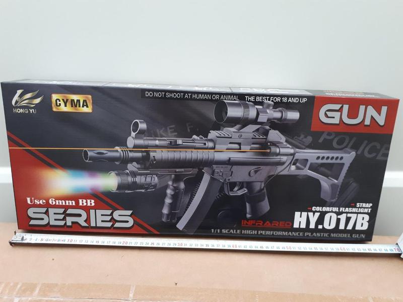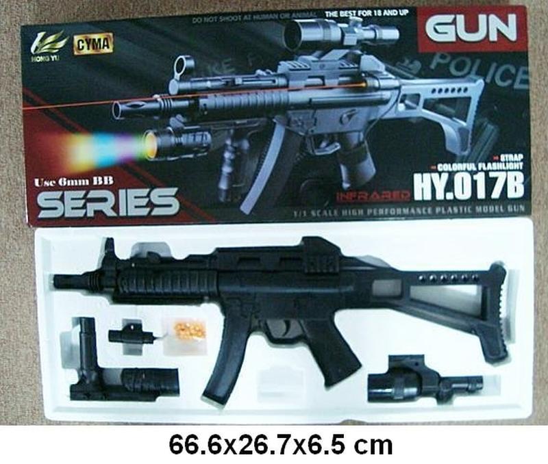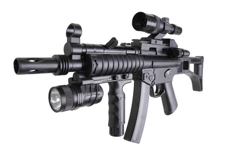 оптичним та лазерним прицілом. Іграшкова зброя заряджається пластиковими