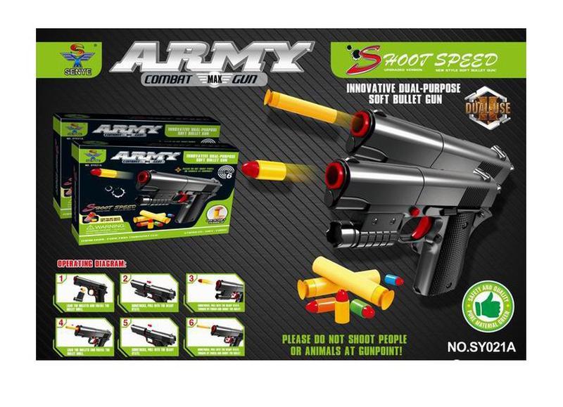 Пластиковий пістолет, що стріляє двома видами м'яких куль. Розміри: 16.5 x 3 x 11 см Вага: 107 г Комплект поставки: Пістолет, гумові кулі - 5 шт; довгі кулі - 2 шт.