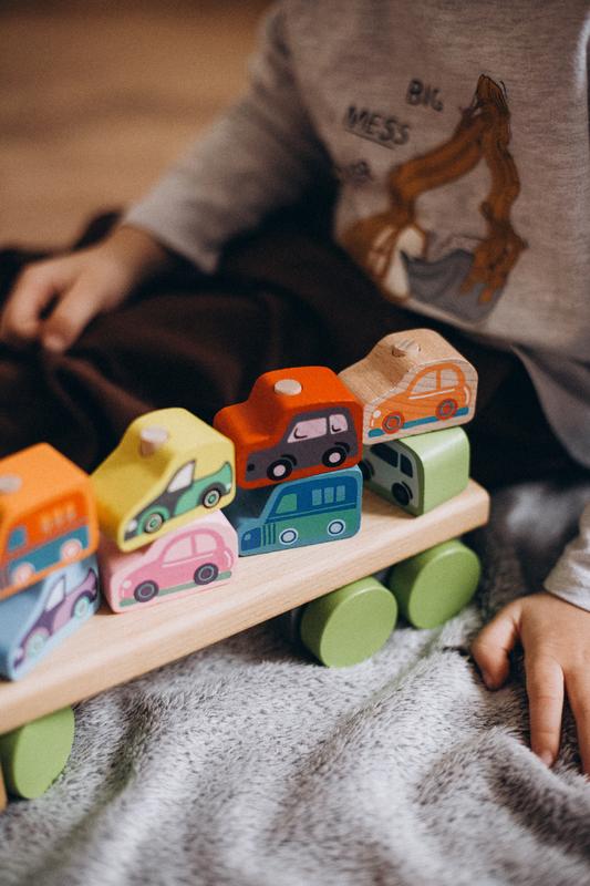 Яскрава різнобарвна машинка тягач з деревʼяною основою і колесами. Поверхня іграшки добре відшліфована, не має гострих країв. У машинки крутяться колеса. Складається з 12-ти елементів.