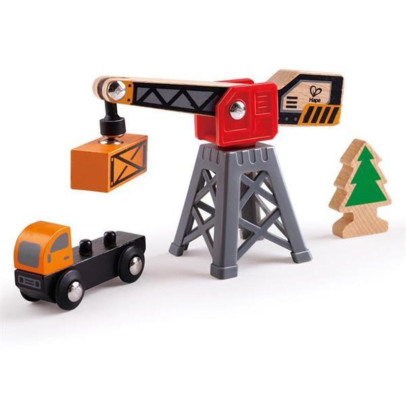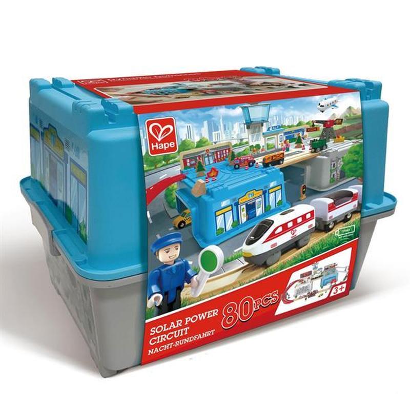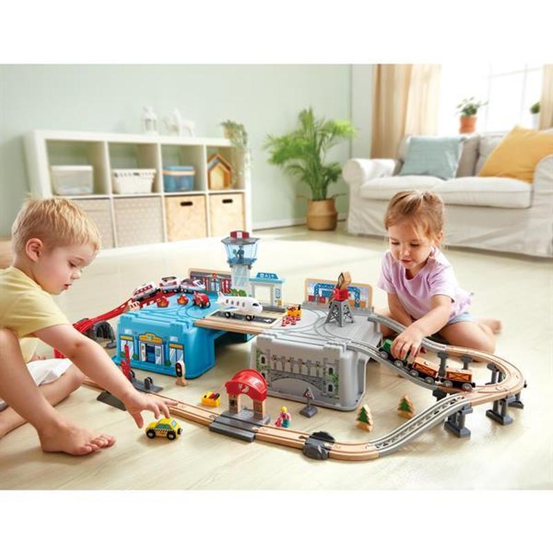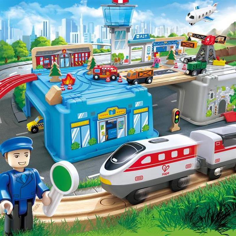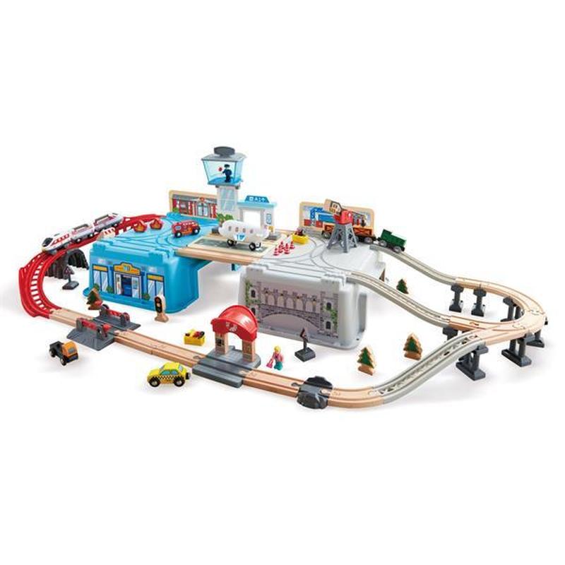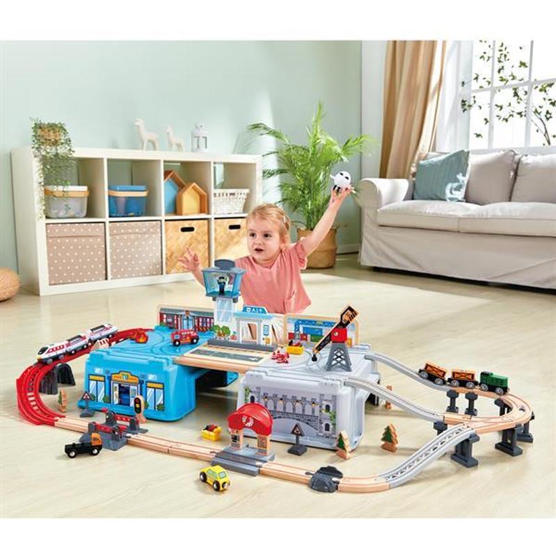 Залізниця Hape у контейнері з численними аксесуарами пропонує дітям захопливі