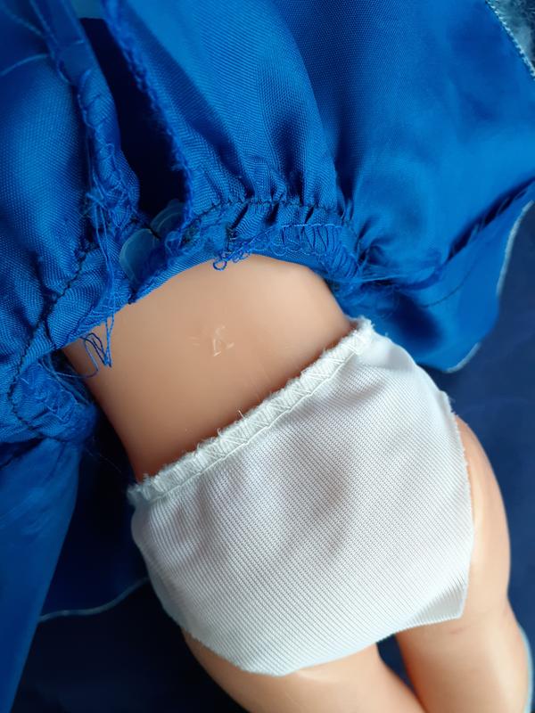 Одета в фабричное нейлоновое платьице и трусики, обута в пластмассовые туфельки. Волосы у Тани голубого цвета, возможно, предполагалось ей быть Мальвиной.