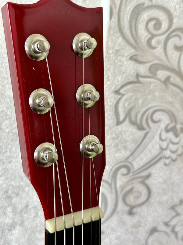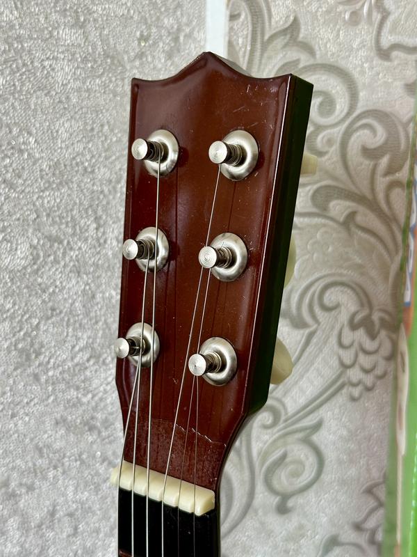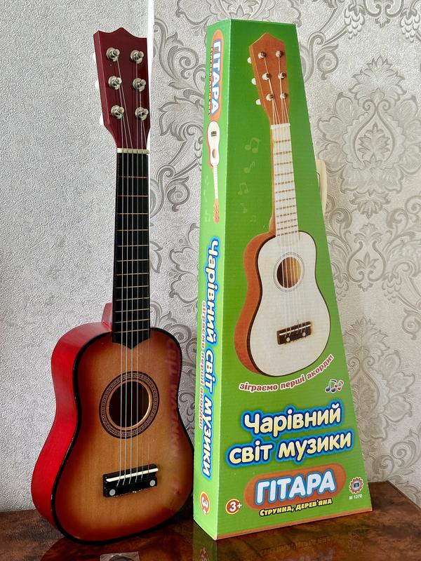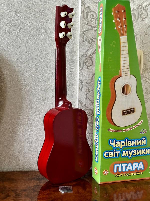 Деревʼяна дитяча гітара . Така гітара з медітатором обов’язково сподобається юному музиканту. Класична акустична шестиструнна гітара. Містить металеві струни, шпильки, які регулюють натяг струн. Довжина гітари 53 см . В комплекті запасна струна .