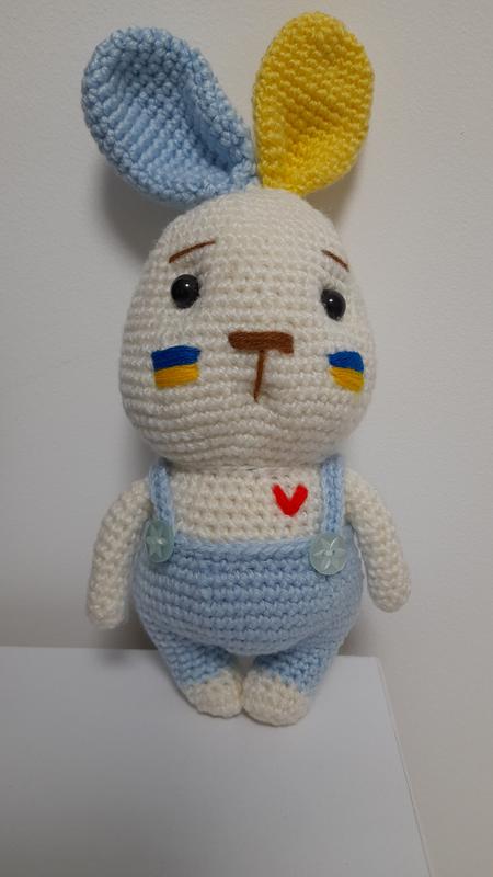 Зайчики-патріоти виконані з акрилової пряжі, наповнювач - холофайбер. Очі на надійному кріпленні. Повністю ручна робота! Зріст - 24 см. Ціна хлопчика - 270 грн, дівчинка - 300 грн. Пара - 500 грн) Стануть гарним подарунком! Відправка того ж дня після оплати.