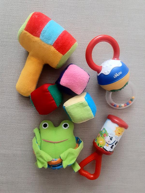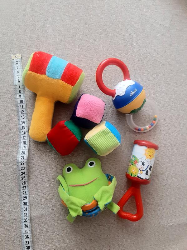 Іграшки м'які молоточок брязкальце, жабка на липучках, брязкальця Chicco пластикові для малюка. Дуже легенькі. У відмінному стані. За все 90 грн