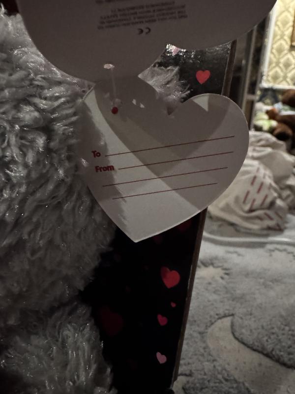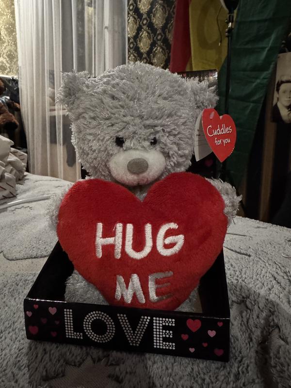 • Тримає червоне серце з ніжним написом “HUG ME”.