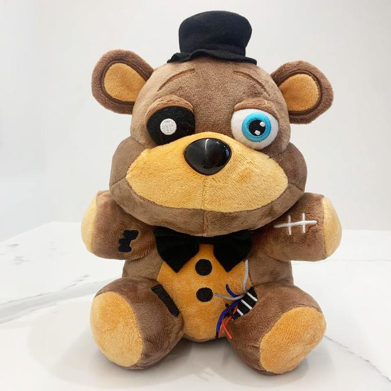М'яка іграшка Фредді з 5 ночей у Фредді (Five Nights at Freddy's) виглядає як справжній лідер аніматроніків — чарівний і трохи лякаючий ведмідь. У нього фірмовий чорний капелюх, бантик і ґудзики, але зовнішній вигляд доповнений потертостями, латками і стирчащими дротами, що надає іграшці атмосферу гри. Одне око вибите, замість нього — лампочка, а інше — яскраво-блакитне, завдяки чому образ Фредді здається особливо виразним і незабутнім. Висота: 25 см Матеріал: Плюш