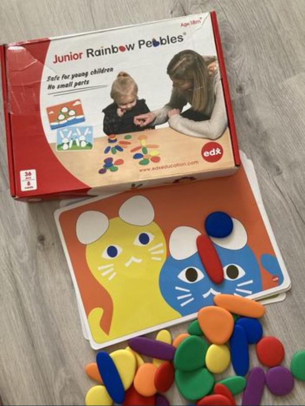 Розвиваючий набір для малечі. У наборі вісім двосторонніх карток з різними завданнями, 36 «камінців», трьох різних форм та розмірів та 6 кольорів. Картки ламіновані. Галька дуже приємна на дотик.