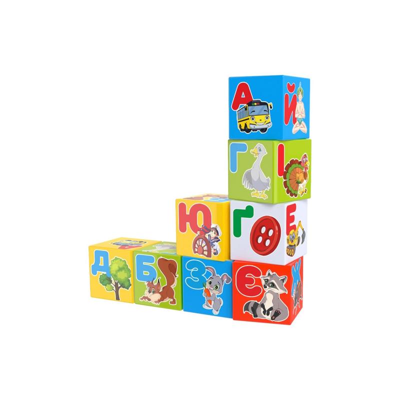 Набір складається з 9 різнокольорових кубиків з буквами українського алфавітуі малюнками. На кожній грані кубика - буква і зображення предмета, назва якогопочинається на цю букву. Розмір кожного кубика: 7х7х7 см. Розмір упаковки:21х21х7 см.