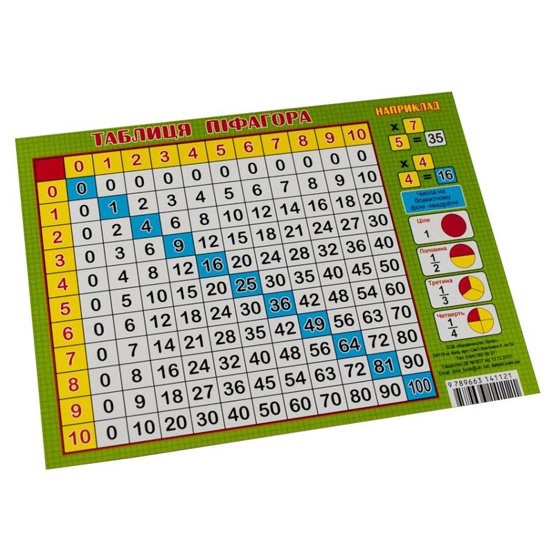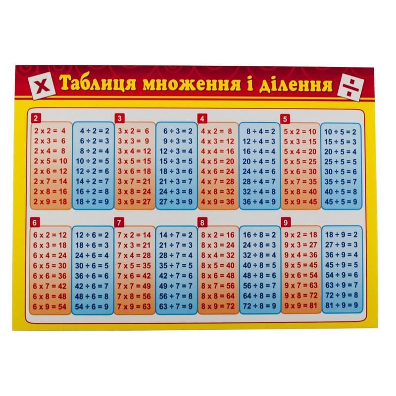 Картонка-підказка містить таблицю множення та поділки, таблицю Піфагора. Вонастане незамінним помічником для учнів початкової (а нерідко й середньої) ланкиосвіти на заняттях у школі та вдома.