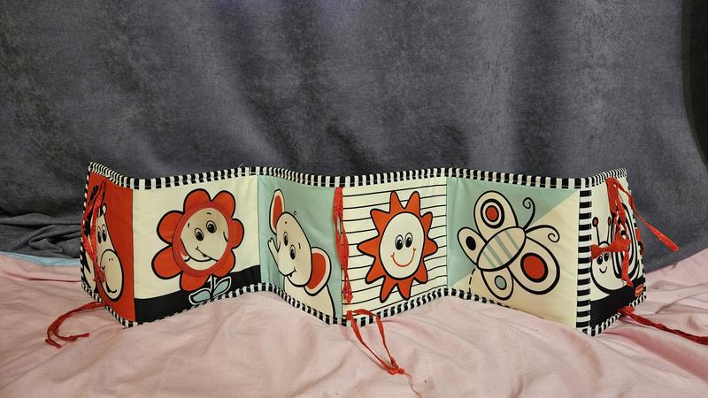 Завдяки спеціальним стрічкам, книжечку можна прив'язати в будь-якому місці, де малюк гратиметься, чи то ліжечко, коляска, стільчик для годування, чи то автокрісло.