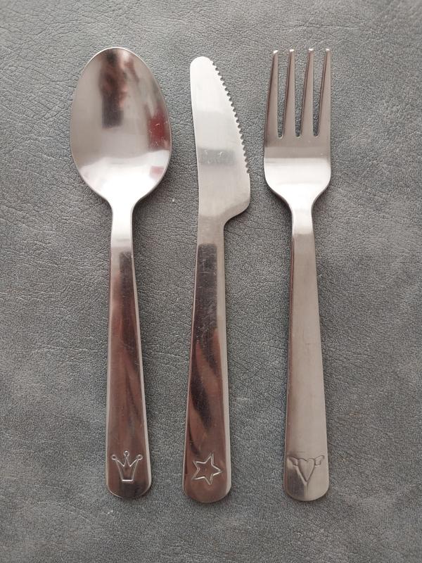 ІКЕА Набір столових приборів FABLER ФАБЛЕР, 601.375.71. Ложка, виделка та ніж, в ідеальному стані. Виготовлені з нержавіючої сталі, можна мити в посудомийній машині та мають відповідний розмір для рук маленької дитини. Ложка ідеальної форми і розміру. Виделка абсолютно безпечна для дитини, має тупі зубчики. Лезо ножа має зубчатий край; полегшує дитині нарізання. Форма ножа дозволяє нарізати їжу навіть на глибокій тарілці.