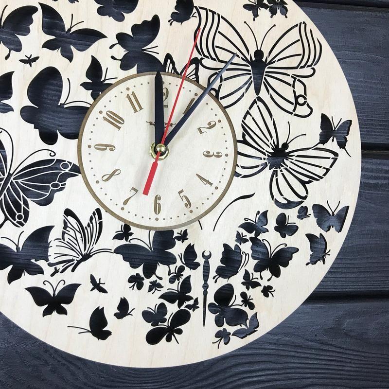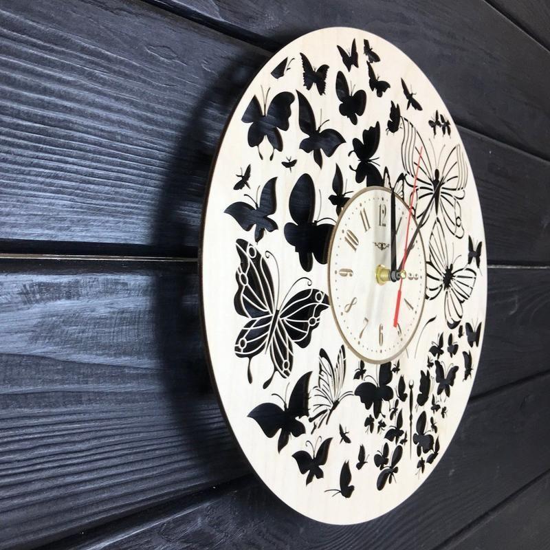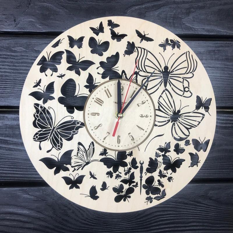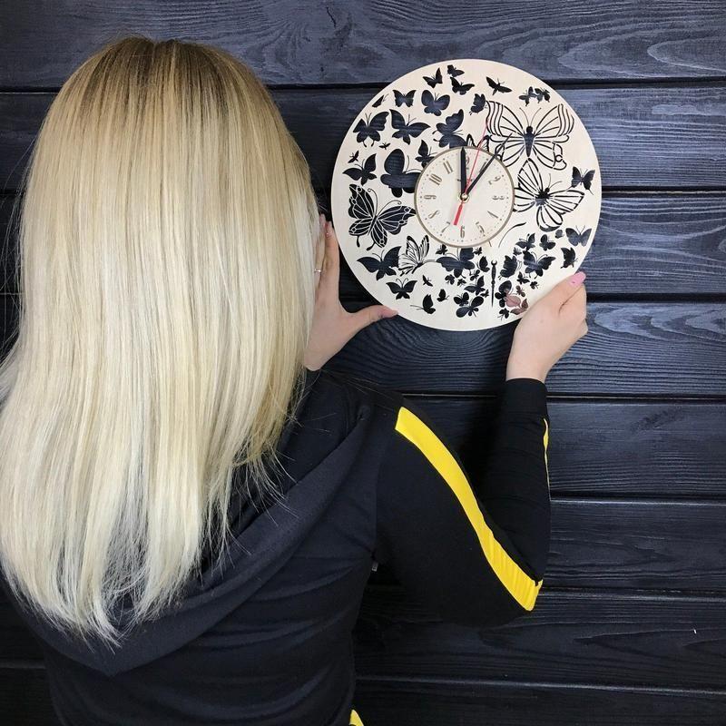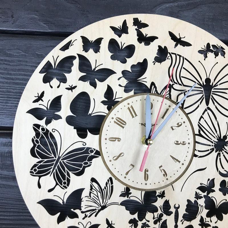 Оригинальные часы настенные с бабочками оживят интерьер салона красоты, модного бутика, кафе или магазина с летней одеждой. Эффектно смотрятся они в гостиной и спальне. Вы можете часы настенные из дерева купить также в подарок женщине, которая обладает романтичной натурой и отменным чувством стиля. Изделие выполнено из натурального дерева и оснащено кварцевым калибром с тихим ходом. Формат отсчета времени – часы, минуты, секунды. Работа механизма обеспечивается пальчиковой батарейкой. Характеристики: Размер часов: 30х30 см Механизм: Кварцовый Материал: Дерево (Берёзовая фанера) Тип кріплення: Петля на механізмі