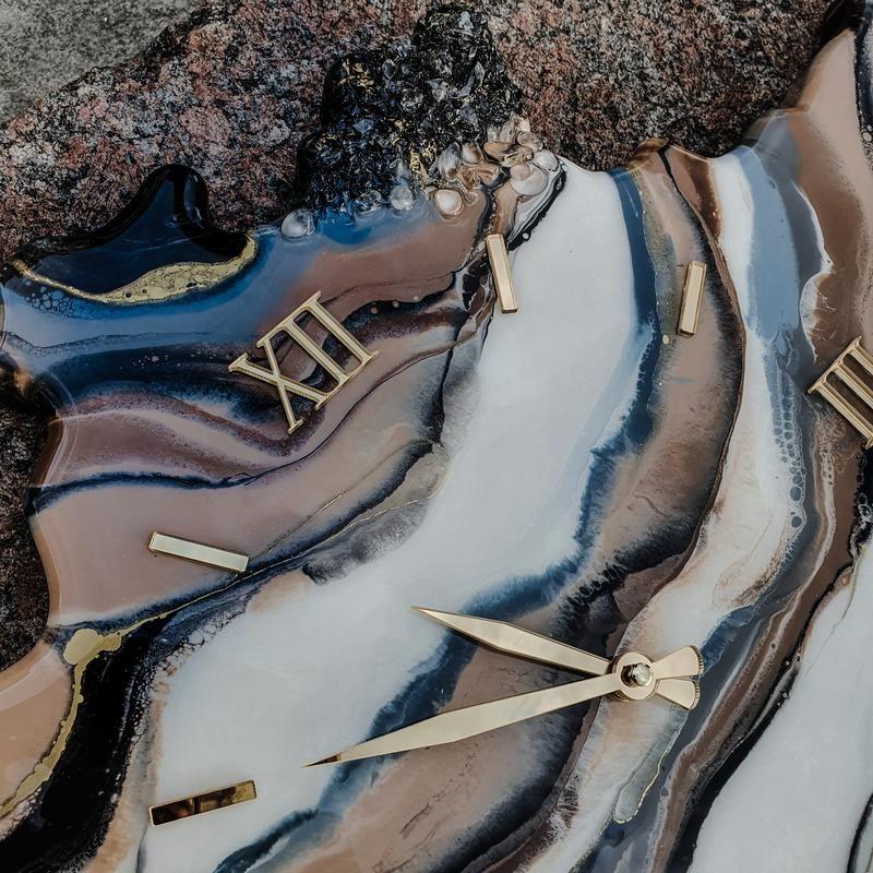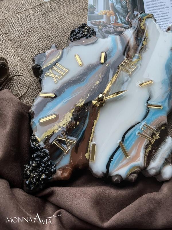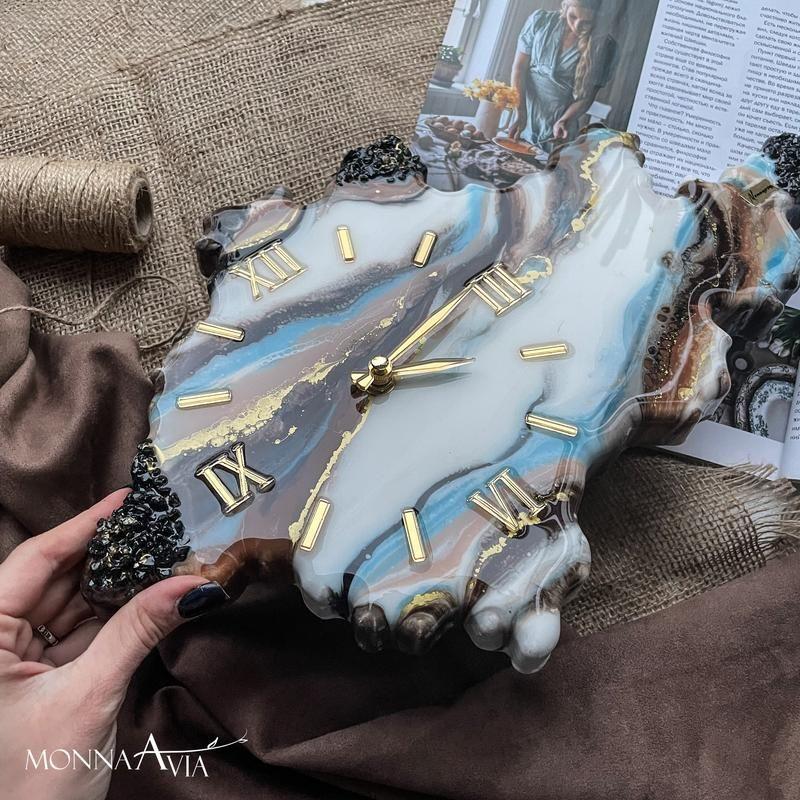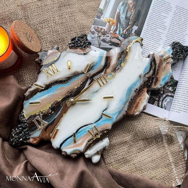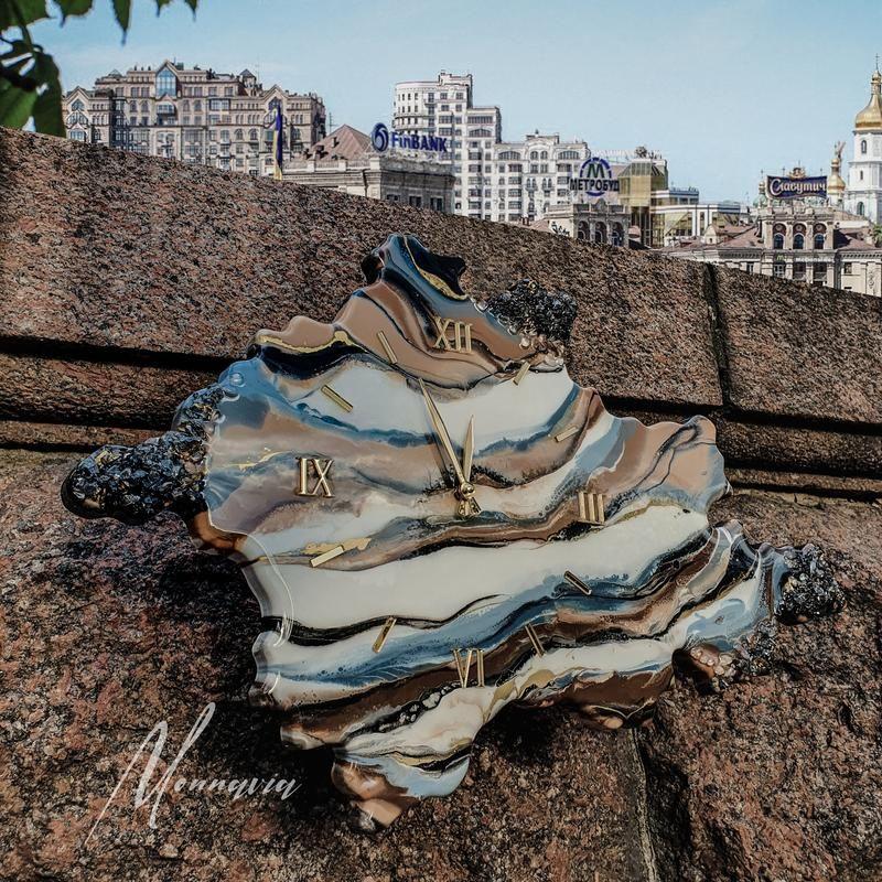 Годинник у вигляді зрізу каменю були зроблені під замовлення. Можливий повтор, так само можемо зробити годинник будь-якої іншої форми і з іншим малюнком. Розмір годин на фото 50х80 см з безшумним механізмом. Товар виготовляється на замовлення