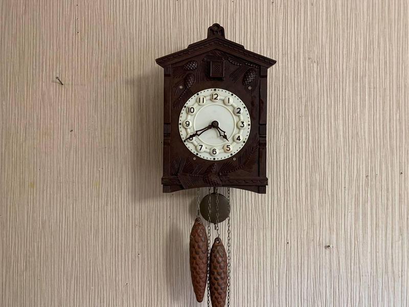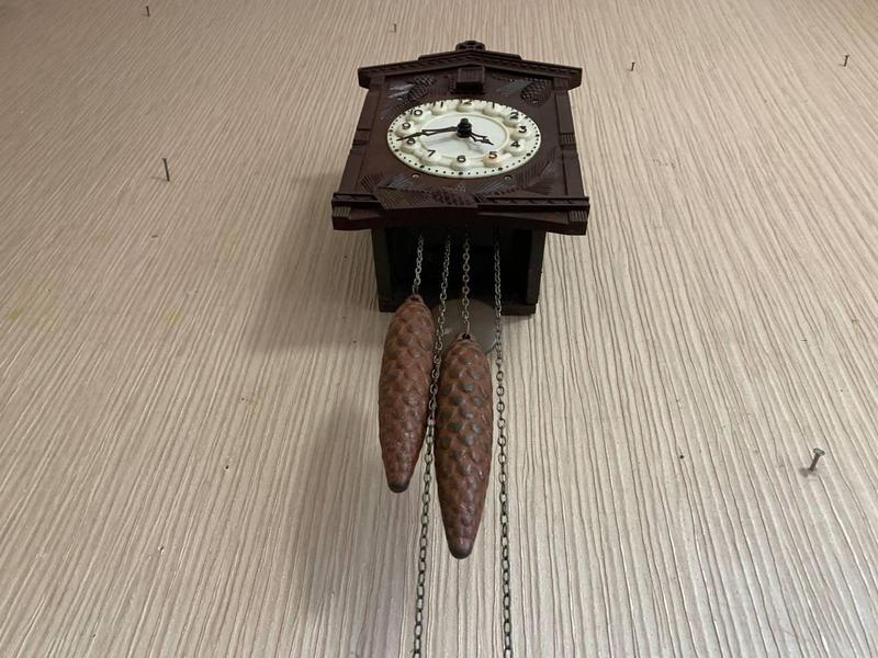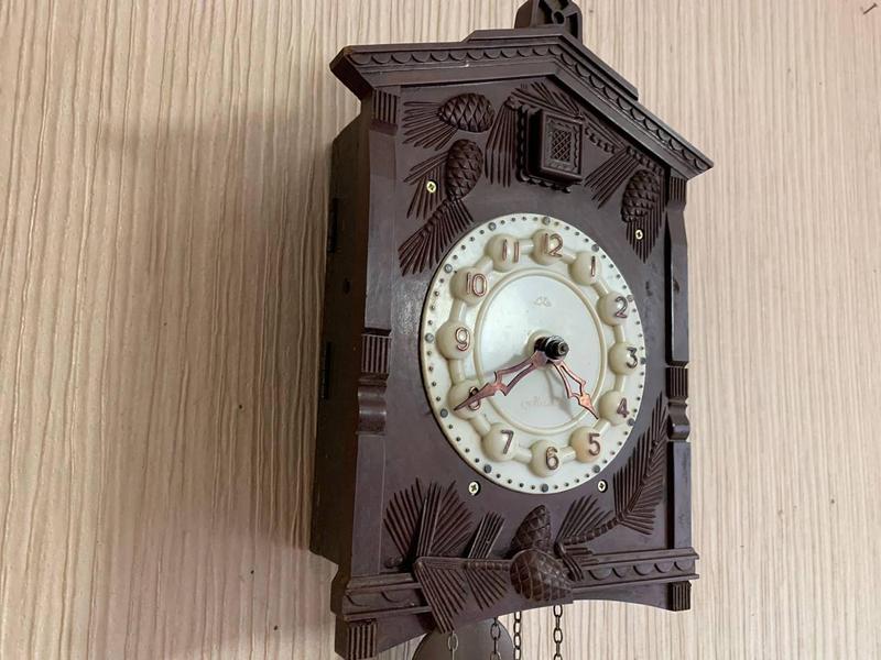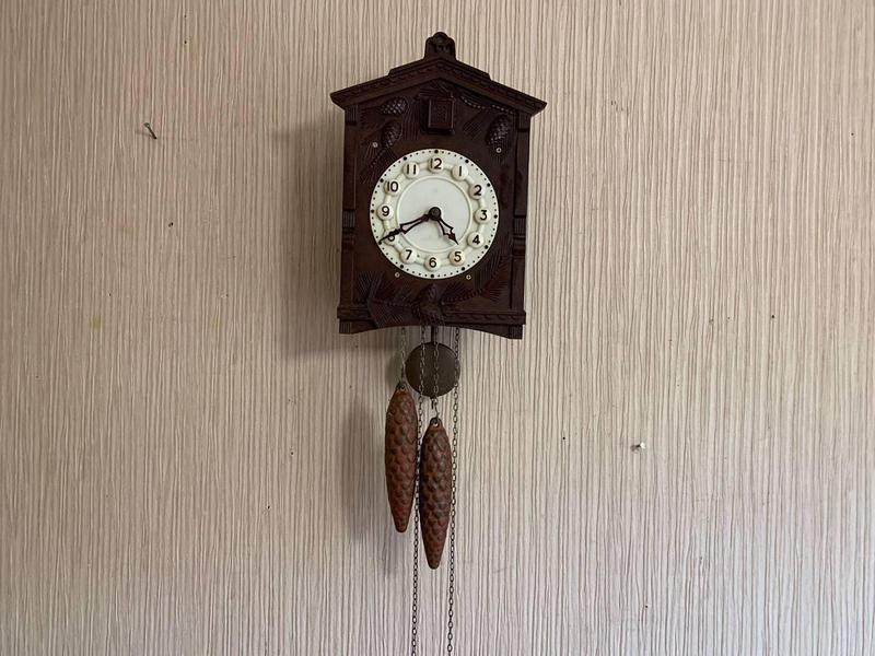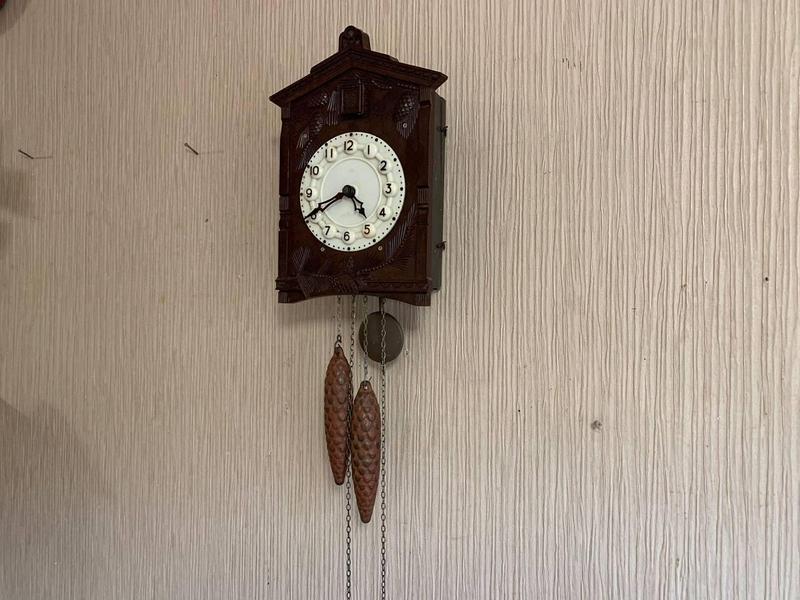 Завод годинника здійснюється шляхом підтягування нагору двох гир, підвішених