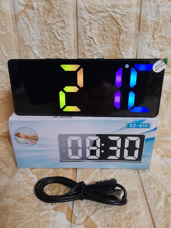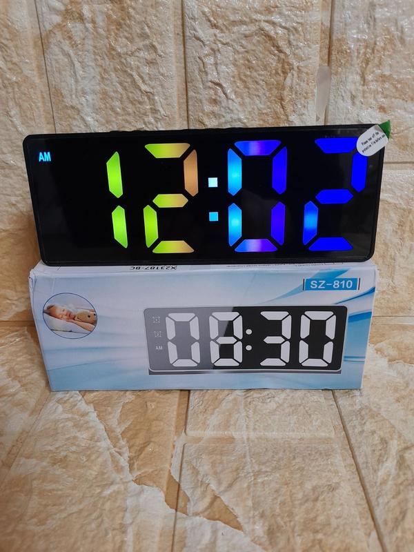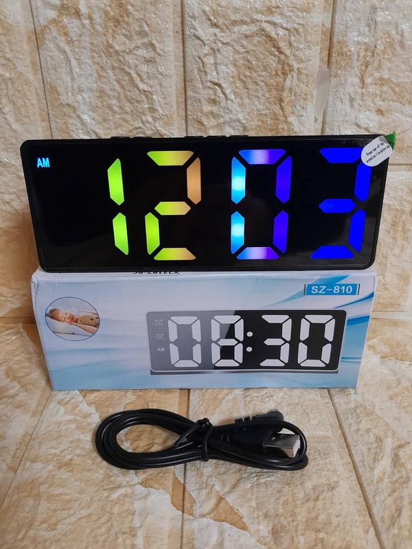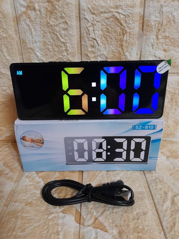Годинник електронний настільний має відсік для батарейок (батарейки в комплект не входять), вони необхідні для збереження заданих налаштувань годинника в момент відключення від мережі, або в момент аварійних відключень електрики. Цей годинник має великі різнокольорові цифри, що надає їм особливого незвичайного вигляду.