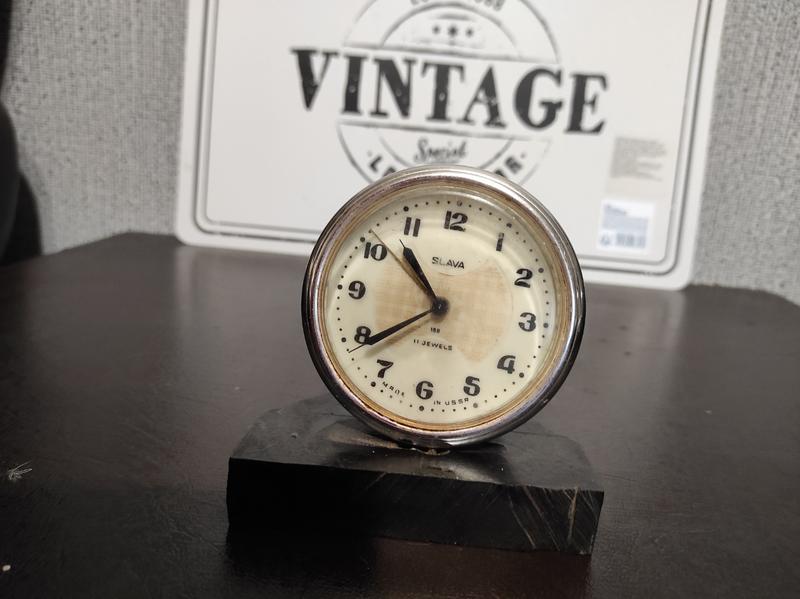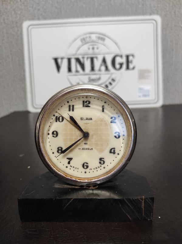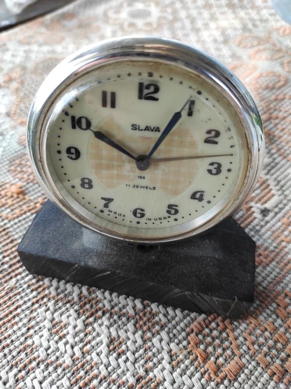 Настільний годинник-будильник, на підставці. Slava Мade in USSR. 11Jewels. Робочий. Заводиться, грає музика. Ні гвинтика для виставлення стрілочками часу