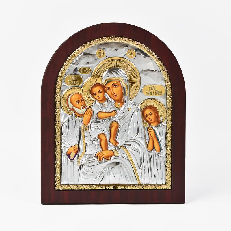 Ікона богородиці "трьох радощів" 14,7х18см срібна аркової форми на дереві