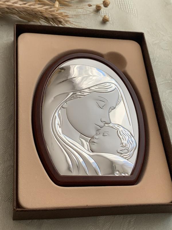 Срібні значок на дереві Богородиця з немовлям. На цій прекрасній іконі